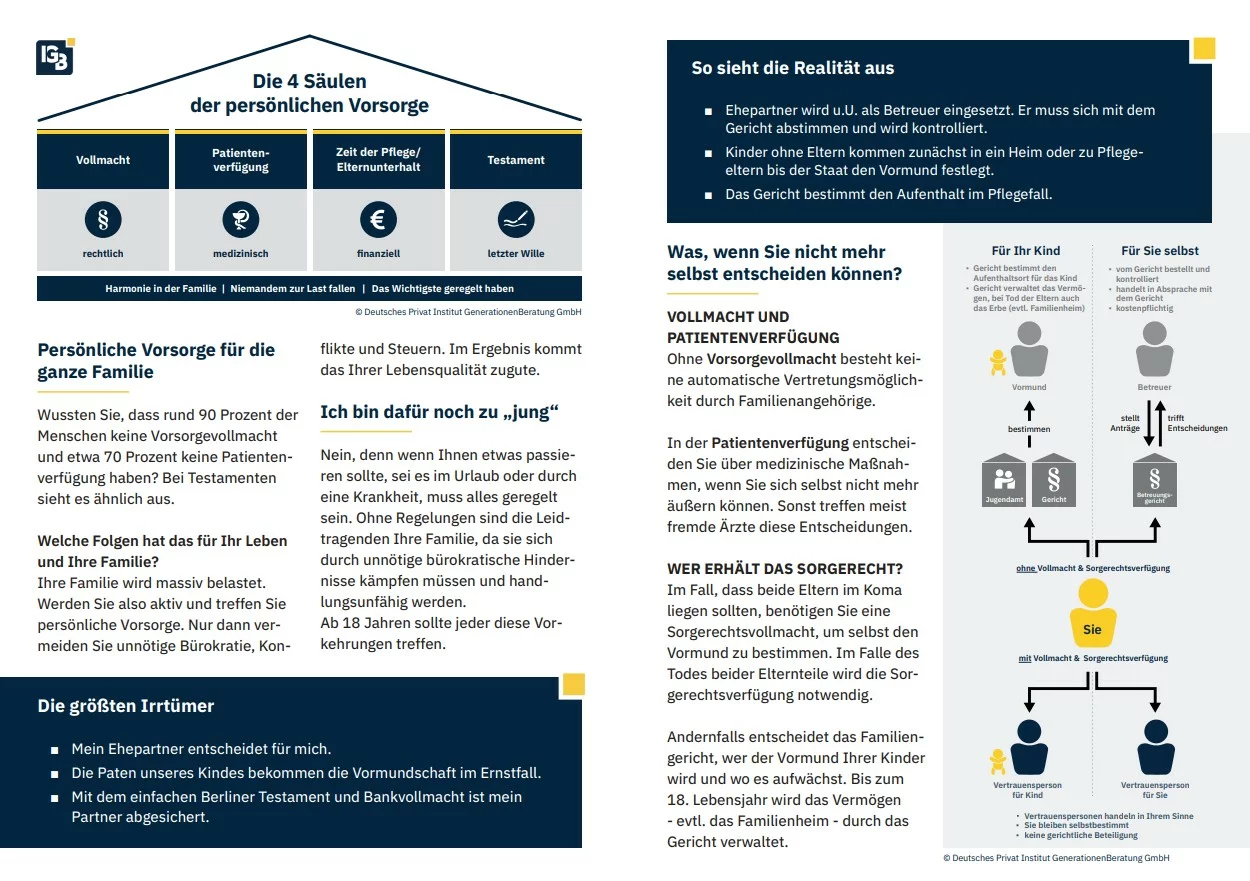 Als Generationenberater (IHK) arbeite ich mit dem Deutschen Privat Institut GenerationenBeratung GmbH Darmstadt zusammen. Beruflich bin ich als ausgebildeter Bankbetriebswirt und Trainer im Finanzbereich tätig. Somit ist ein ganzheitlicher und qualitativer Blick durch mich garantiert.