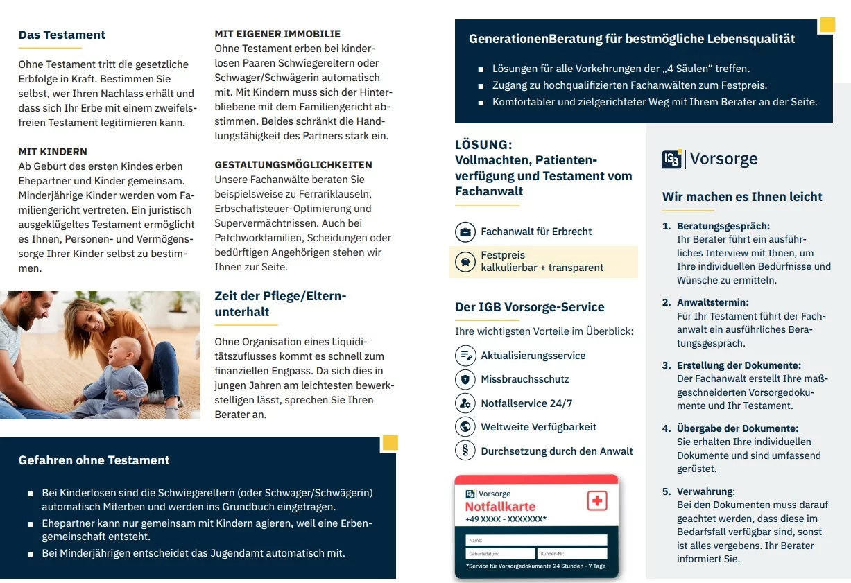 Keine Notarkosten, Fallabschließend, Exklusiver Zugang zu unseren Fachanwälten, IGB Vorsorge-Software für rechtssichere Umsetzung, keine extra Wege - Webmeeting, Jährliche Aktualisierung möglich, Notfallpass